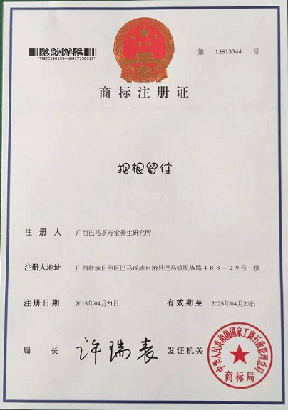历时2年多的等待,广西把根留住医药科技有限公司下属全资企业广西巴马茶寿堂养生研究所等来了“把根留住”商标注册证。
